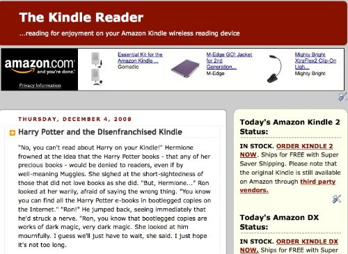 With more than one million books in the Amazon Kindle book store, finding one you want to read can be a daunting task. The Kindle Reader, written by a librarian and bibliophile, is all about saving you time in your search for that elusive "good read." Featuring regular posts like Genre Watch (the newest mystery, sci-fi, romance, fantasy and western fiction for your Kindle), E-books on the Cheap (a selection of free e-books from a variety of sources), Kindle books reviewed in Entertainment Weekly and People Magazine, and reviews of historical fiction, biographies, and nonfiction, the Kindle Reader is updated regularly every other day.Kindle blogs are fully downloaded onto your Kindle so you can read them even when you're not wirelessly connected. And unlike RSS readers which often only provide headlines, blogs on Kindle give you full text content and images, and are updated wirelessly throughout the day.